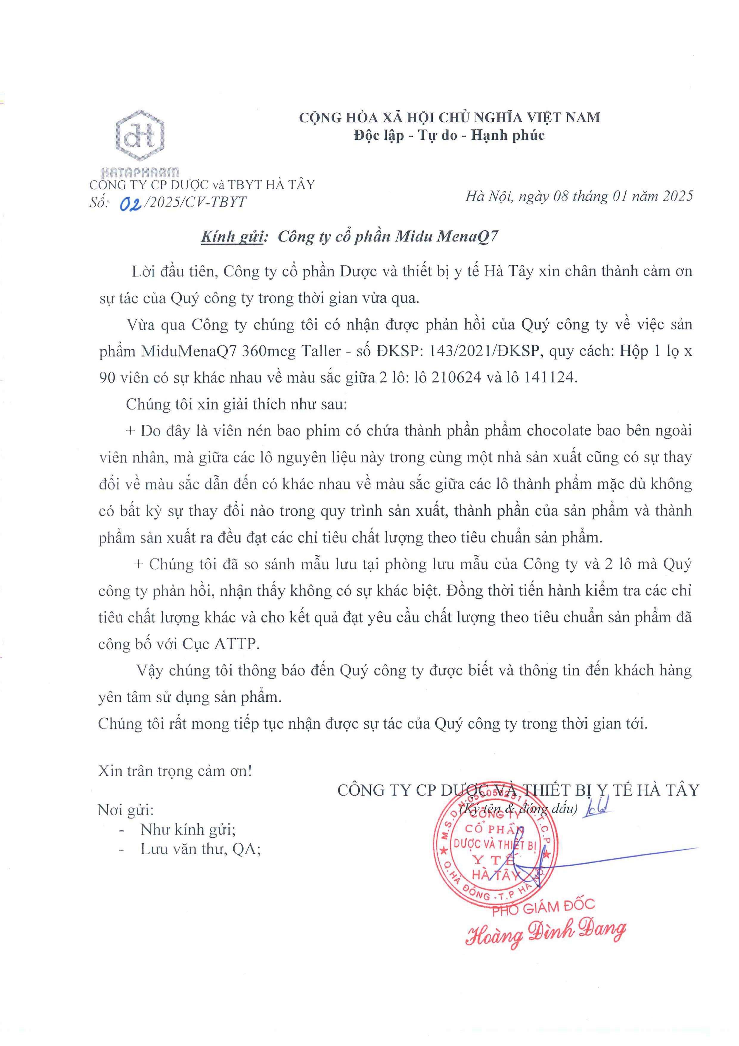 Trong thời gian gần đây, Công ty Cổ phần Midu đã tiếp nhận một số phản hồi liên quan đến sự khác biệt về màu sắc của viên nang Midu MenaQ7 360mcg Taller giữa hai lô sản xuất: lô 210624 và lô 141124.