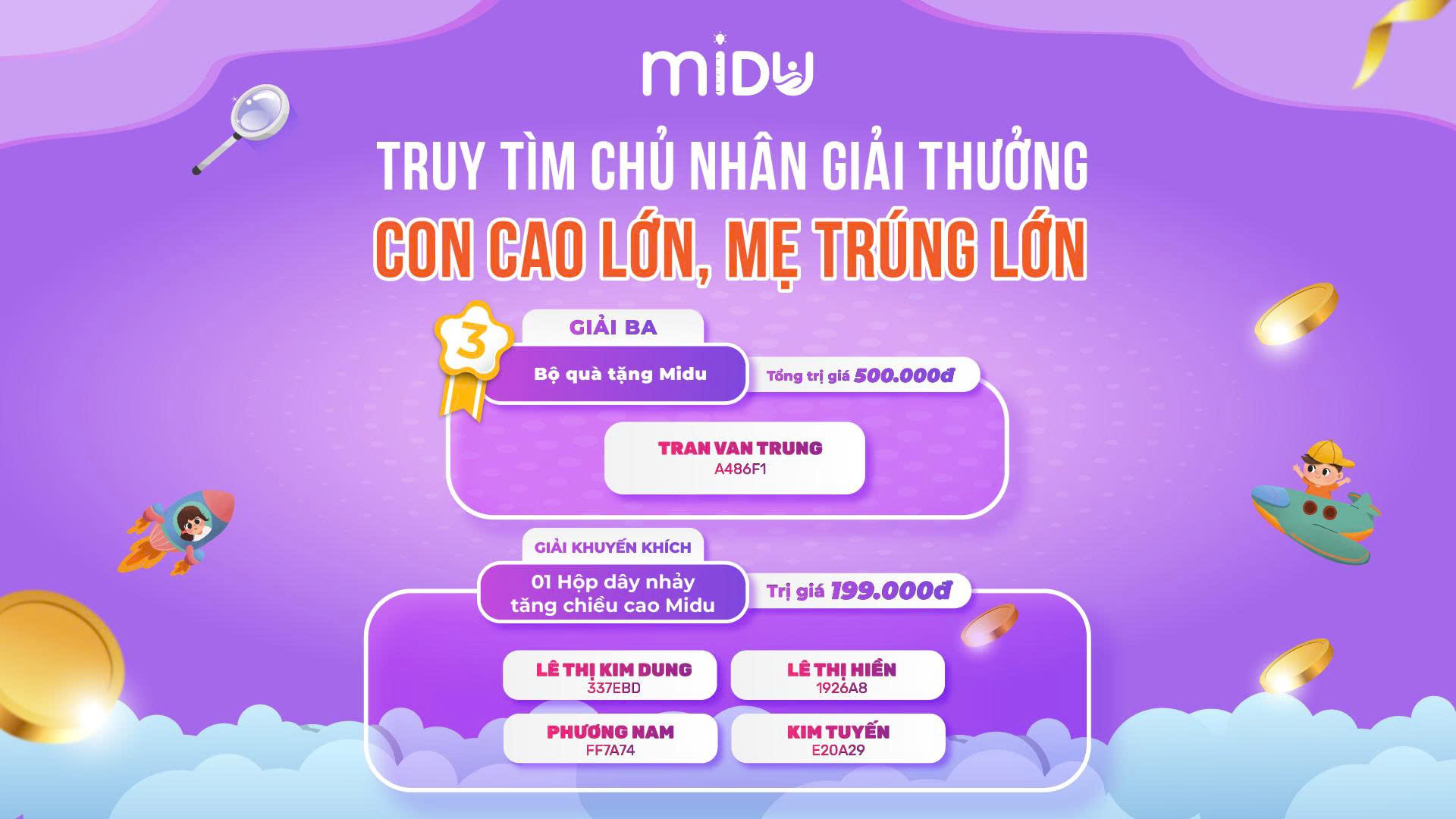Nhằm đảm bảo quy trình trao thưởng minh bạch - đúng hạn - thống nhất, Midu xin thông báo: Trong vòng 07 ngày kể từ ngày đăng thông báo này, nếu chủ nhân các mã trúng giải trên không liên hệ và xác nhận đầy đủ thông tin, Midu sẽ hủy tư cách nhận giải và không tiếp tục xử lý trao thưởng đối với các mã nêu trên.